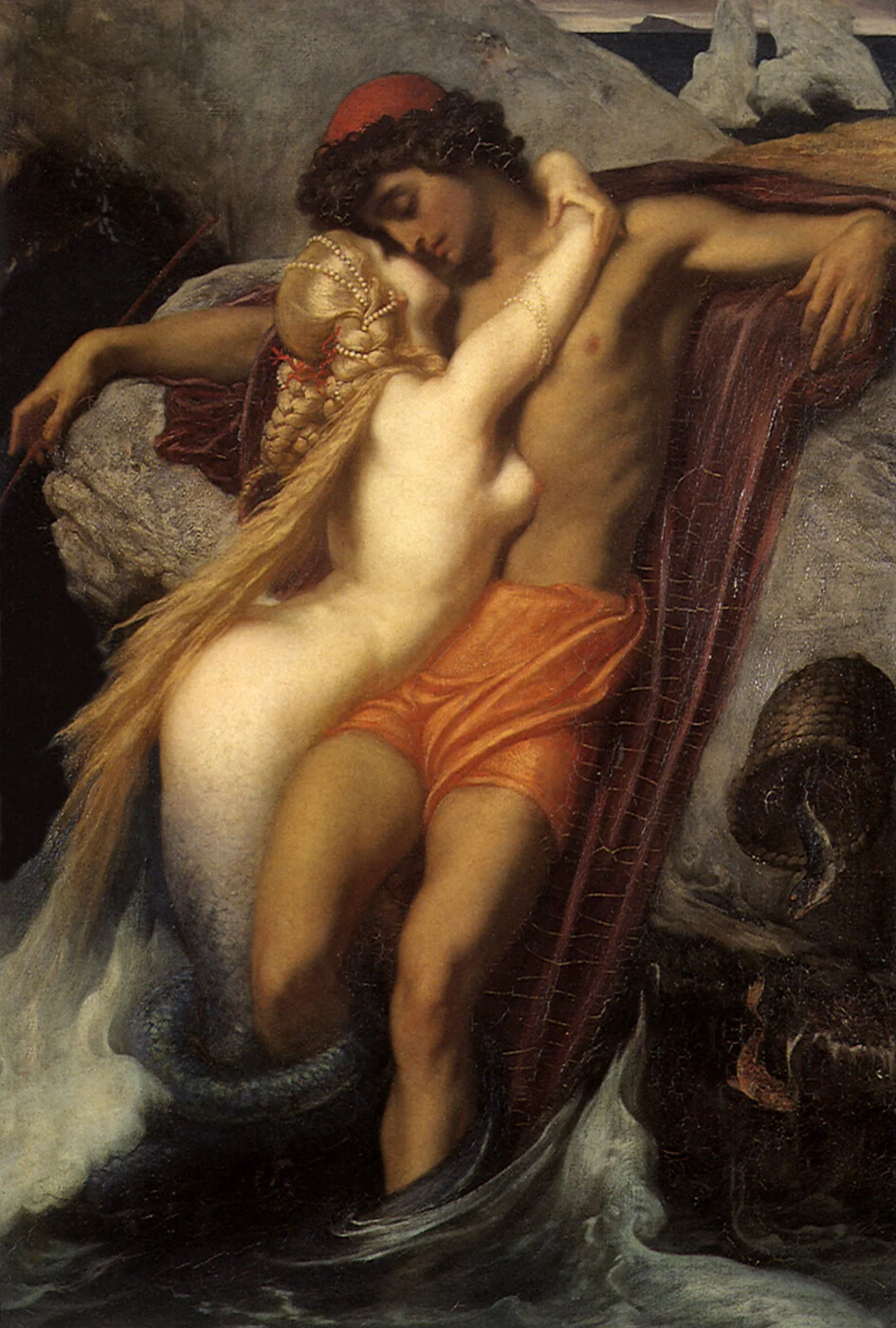 Για παράδειγμα, το «Φιλί» του Γκούσταφ Κλιμτ. Ένα αναμφισβήτητο αριστούργημα από τη «Χρυσή Περίοδο» του Αυστριακού καλλιτέχνη, πρόκειται για έναν πίνακα ταυτόχρονα ερωτικό και τρυφερό. Ο Κλιμτ εμπνεύστηκε από το στυλ των ιαπωνικών ψηφιδωτών και την παγκόσμια έλξη της ρομαντικής αγάπης. «"Το φιλί" ενσαρκώνει συναισθήματα τρυφερότητας και αγάπης και απευθύνεται σε όλες τις γενιές ανθρώπων», είχε πει ο Franz Smola, επιμελητής του μουσείου Upper Belvedere στη Βιέννη, όταν η γκαλερί γιόρτασε την 100ή επέτειο από το θάνατο του Κλιμτ το 2018. Αν και τα ακόλουθα αριστουργήματα είναι ικανά να ξυπνήσουν συναισθήματα ρομαντισμού οποιαδήποτε εποχή του χρόνου, η Ημέρα του Αγίου Βαλεντίνου είναι αναμφίβολα η κατάλληλη στιγμή για να τα ξαναδούμε. «Ο ψαράς και η σειρήνα» του Frederic Leighton (1856-58): Δεν χρειάζεται να είναι κανείς κριτικός τέχνης για να δει το πάθος που αποτυπώνεται σε αυτόν τον πίνακα που έχει εμπνευστεί από την ελληνική μυθολογία. Βέβαια, οι μυθικές σειρήνες θεωρούνταν ότι παρέσυραν τους ναυτικούς στον θάνατο.