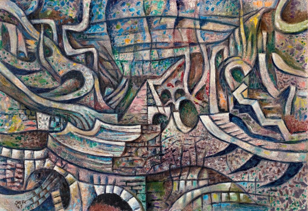 Με τιμή εκτίμησης από 60.000 έως 80.000 ευρώ ακολουθεί η «Γέφυρα στη Σαντορίνη» του Νίκου Χατζηκυριάκου Γκίκα (1906-1994), ένα έργο που αποδίδει με ένταση και δυναμισμό τη σύνθετη αρχιτεκτονική του νησιού μέσα από ένα εικαστικό λεξιλόγιο που αντλεί από τη γεωμετρική ανάλυση του τοπίου και τη μετακυβιστική ανασύνθεση των μορφών. Οι καμπύλες, τα θραυσμένα επίπεδα και οι αιχμηρές γωνίες συνθέτουν ένα πυκνό πλέγμα που θυμίζει λαβύρινθο, μεταφέροντας στον θεατή την αίσθηση ενός χώρου σε διαρκή κίνηση. Όπως είχε επισημάνει ο Οδυσσέας Ελύτης, ο Νίκος Χατζηκυριάκος Γκίκας κατορθώνει να μετατρέψει τη γεωμετρία σε ποίηση, ενώ ο ίδιος ο καλλιτέχνης τόνιζε ότι η γεωμετρική δομή αποτελεί διαχρονικό στοιχείο της ελληνικής τέχνης, από την αρχαιότητα έως τη λαϊκή παράδοση. Το έργο του λειτουργεί έτσι ως μια βαθιά στοχαστική μεταγραφή του αιγαιοπελαγίτικου τοπίου σε καθαρή ζωγραφική ενέργεια.