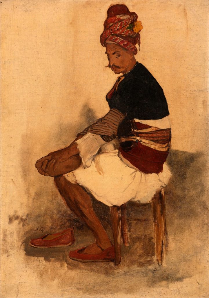 Με ιδιαίτερο ιστορικό ενδιαφέρον παρουσιάζεται «Ο Ζεϊμπέκης» του Νικόλαου Γύζη (1842-1901), με τιμή εκτίμησης από 50.000 έως 70.000 ευρώ. Φιλοτεχνημένο το 1873, το έργο προέκυψε κατά τη διάρκεια του καθοριστικού ταξιδιού του καλλιτέχνη στη Μικρά Ασία μαζί με τον Νικηφόρο Λύτρα, όταν οι δύο ζωγράφοι αποτύπωσαν από κοντά πρόσωπα, φορεσιές και σκηνές της τοπικής καθημερινότητας. Η έντονη φυσιογνωμία του νεαρού Ζεϊμπέκη προβάλλεται σε φωτεινό, σχεδόν μονοχρωματικό φόντο, με περιορισμένη αλλά εξαιρετικά εκφραστική χρωματική παλέτα. Η λευκή βράκα, το κεντημένο γιλέκο, η φαρδιά ζώνη με τα φυσεκλίκια και τα χαρακτηριστικά σανδάλια αναδεικνύουν την ιδιαίτερη ταυτότητα αυτής της μορφής της δυτικής Ανατολίας. Το ταξίδι αυτό επηρέασε βαθιά τη ζωγραφική του Νικόλαου Γύζη, οδηγώντας τον σε μια νέα προσέγγιση όπου η ακαδημαϊκή παιδεία της Σχολής του Μονάχου συνδυάστηκε με μια βιωματική και εσωτερική αντίληψη της Ανατολής, όχι ως εξωτικού θεάματος αλλά ως οικείας πραγματικότητας.