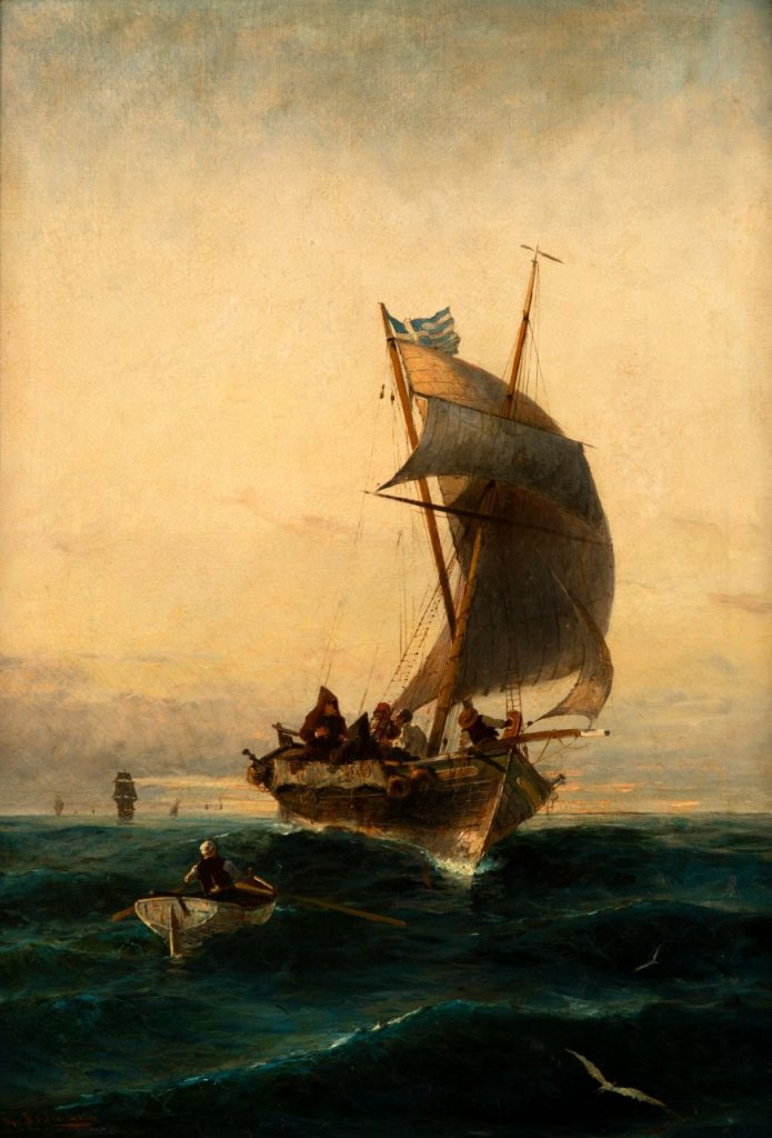 Στην ίδια κλίμακα εκτίμησης, από 50.000 έως 70.000 ευρώ, εντάσσεται και το «Με όλα τα πανιά ανοιχτά» του Κωνσταντίνου Βολανάκη (1837-1907). Η σκηνή αποτυπώνει με εντυπωσιακή φρεσκάδα και ενέργεια ένα καΐκι που σχίζει τα κύματα υπό την πίεση του ανέμου, μεταδίδοντας μια αίσθηση ελευθερίας, αισιοδοξίας και θαλασσινής αντοχής. Η σύνθεση χαρακτηρίζεται από έντονες διαγώνιες γραμμές και από μια λεπτή ισορροπία ανάμεσα στη φύση και την ανθρώπινη παρουσία, ενώ η απόδοση του φωτός και του ουρανού δημιουργεί βάθος, ατμοσφαιρική ένταση και μια σχεδόν απτή αίσθηση ανοιχτού χώρου. Ο Κωνσταντίνος Βολανάκης αντιμετωπίζει τη θάλασσα ως έναν ενιαίο ζωντανό οργανισμό, μέσα στον οποίο ο άνθρωπος συνυπάρχει με τις δυνάμεις της φύσης, προσφέροντας μια εικόνα του ελληνικού τοπίου που είναι ταυτόχρονα ποιητική και απολύτως πειστική.