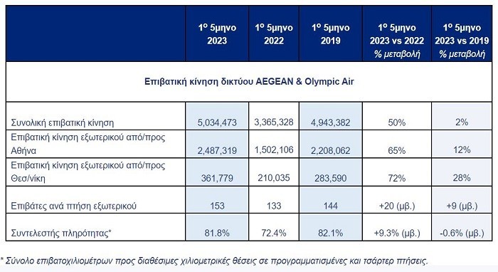 Περισσότερους από 5 εκατ. επιβάτες μετέφερε συνολικά η Aegean κατά το διάστημα Ιανουαρίου – Μαΐου του 2023, καταγράφοντας αύξηση 50% στην επιβατική κίνηση σε σχέση με το αντίστοιχο διάστημα του 2022.