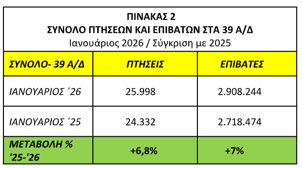 Όσον αφορά τον αριθμό κινήσεων αεροσκαφών (αφίξεις και αναχωρήσεις αεροσκαφών εσωτερικού και εξωτερικού) για τον Ιανουάριο του 2026, στο σύνολο των 39 αεροδρομίων της χώρας, των οποίων τον έλεγχο εναέριας κυκλοφορίας ασκεί, κυρίως, η ΥΠΑ, σημειώθηκε αύξηση 6,8% σε σχέση με το αντίστοιχο διάστημα του 2025. Ειδικότερα, συνολικά πραγματοποιήθηκαν 25.998 πτήσεις, έναντι 24.332 πτήσεων πέρυσι.