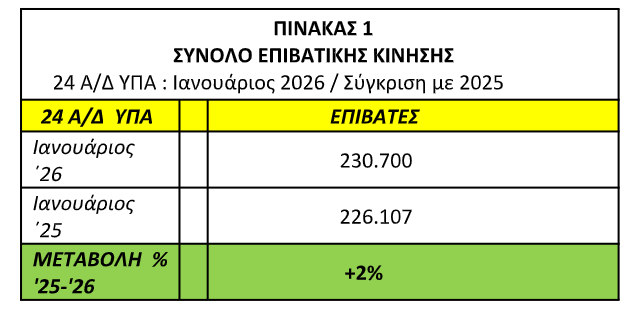 Άνοδο 2% παρουσίασε η επιβατική κίνηση στα 24 αεροδρόμια διαχείρισης της ΥΠΑ (Ηράκλειο, Καλαμάτα, Αλεξανδρούπολη, Λήμνος, Αστυπάλαια, Ιωάννινα, Χίος, Κοζάνη, Καστοριά, Κάρπαθος, Κύθηρα, Μήλος, Σκύρος, Νέα Αγχίαλος, Πάρος, Σύρος, Άραξος, Νάξος, Κάλυμνος, Ικαρία, Καστελόριζο, Κάσος, Λέρος, Σητεία) τον Ιανουάριο του 2026, σε σχέση με τον Ιανουάριο του 2025.