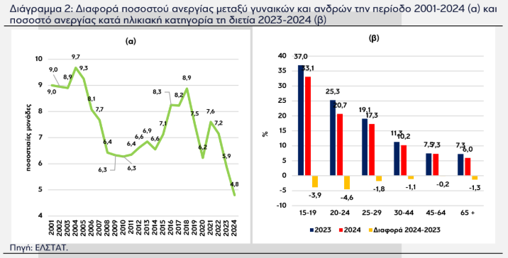 Με βάση το φύλο, η πτώση του ποσοστού ανεργίας ήταν ισχυρότερη στις γυναίκες (-1,6 π.μ.) συγκριτικά με τους άνδρες (-0,5 π.μ.), αλλά παραμένει υψηλότερο στις πρώτες (12,8% το 2024) σε σχέση με τους δεύτερους (8,0% το 2024). Σημειώνεται ότι μετά το 2018, η διαφορά στα ποσοστά ανεργίας μεταξύ των δύο φύλων ακολουθεί πτωτική πορεία (Διάγραμμα 2α). Αναφορικά με την ηλικία, η ισχυρότερη μείωση στο ποσοστό ανεργίας εντοπίζεται στα άτομα ηλικίας 20-24 ετών (-4,6 π.μ., στο 20,7%) και 15-19 ετών (-3,9 π.μ., στο 33,1%), ενώ στις ηλικιακές κατηγορίες 30-44 και 45-64 ετών το ποσοστό ανεργίας κατήλθε στο 10,2% (από 11,3%) και 7,3% (από 7,5%) αντίστοιχα. Διαχρονικά το χαμηλότερο ποσοστό ανεργίας παρουσιάζεται στην ηλικιακή ομάδα άνω των 65 ετών (6,0% το 2024 από 7,3% το 2023). Σημειώνονται, επίσης, τα χαμηλά ποσοστά συμμετοχής των γυναικών και των νέων ηλικίας 20-24 ετών στην αγορά εργασίας τα οποία το 2024 διαμορφώθηκαν σε 45,3% (από 44,9% το 2023) και 47,8% (από 48,9%) αντίστοιχα.