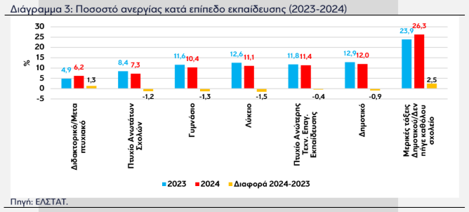 Σε σχέση με το επίπεδο εκπαίδευσης, η ισχυρότερη μείωση εντοπίζεται στα άτομα με Απολυτήριο Λυκείου (-1,5 π.μ., στο 11,1%) και στα άτομα με απολυτήριο Γυμνασίου (-1,3 π.μ., στο 10,4%). Στα άτομα με Διδακτορικό/Μεταπτυχιακό τίτλο – που διαχρονικά παρουσιάζουν τα χαμηλότερα ποσοστά ανεργίας – και στα άτομα που παρακολούθησαν Μερικές τάξεις Δημοτικού/Δεν πήγαν καθόλου σχολείο – που διαχρονικά παρουσιάζουν τα υψηλότερα ποσοστά ανεργίας – το αντίστοιχο ποσοστό παρουσίασε την υψηλότερη αύξηση, ανερχόμενο στο 6,2% (από 4,9%, +1,3 π.μ.) και στο 26,3% (από 23,9%, +2,5 π.μ.).