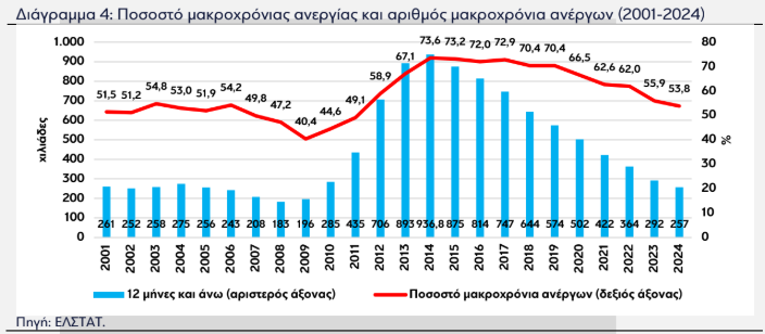 Το ποσοστό των μακροχρόνια ανέργων το 2024 περιορίστηκε περαιτέρω στο 53,8% από 55,9% το 2023 και ο αριθμός των μακροχρόνια ανέργων στους 257,4 χιλ. από τους 292,0 χιλ. το 2023. Συνολικά, από το 2014 (έτος που παρουσιάστηκε το υψηλότερο ποσοστό μακροχρόνιας ανεργίας και ο υψηλότερος αριθμός μακροχρόνια ανέργων) μέχρι το 2024 ο αριθμός των μακροχρόνια ανέργων έχει μειωθεί κατά 679,4 χιλ. άτομα, ενώ την τελευταία διετία έχει περιοριστεί κάτω από τα επίπεδα των 300,0 χιλ. Παράλληλα, την ίδια περίοδο το ποσοστό μακροχρόνιας ανεργίας έχει μειωθεί κατά 19,8 π.μ., αλλά με βραδύτερο ρυθμό συγκριτικά με τον αριθμό των μακροχρόνια ανέργων.