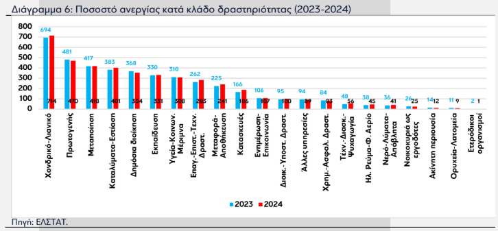 Σχετικά με την κλαδική διάσταση της απασχόλησης, σε εννέα κλάδους μειώθηκε και στους υπόλοιπους 12 αυξήθηκε. Η αύξηση της απασχόλησης το 2024 οφείλεται στην αύξηση της κυρίως στους κλάδους: