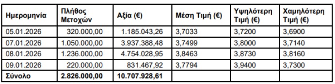 Ειδικότερα, «η ΑΛΦΑ ΤΡΑΠΕΖΑ (η ‘Τράπεζα’), σε συνέχεια της από 17.09.2025 ανακοίνωσής της, ενημερώνει ότι, στο Πλαίσιο του Προγράμματος Αγοράς Ιδίων Μετοχών που εγκρίθηκε με την απόφαση της Έκτακτης Γενικής Συνέλευσης των Μετόχων της με ημερομηνία 12.6.2025, κατά το διάστημα 05.01.2026 – 09.01.2026, προέβη σε αγορά μέσω του Χρηματιστηρίου Αθηνών συνολικά 2.826.000 ίδιων μετοχών, με μέση τιμή κτήσης 3,7891€ ανά μετοχή και συνολικό κόστος 10.707.928,61€.