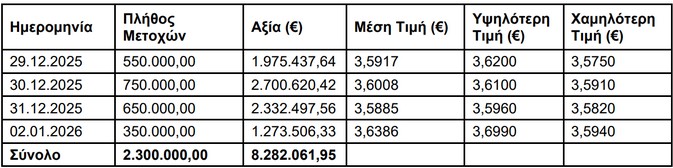 H ΑΛΦΑ ΤΡΑΠΕΖΑ (η ‘Τράπεζα’), σε συνέχεια της από 17.09.2025 ανακοίνωσής της, ενημερώνει ότι, στο Πλαίσιο του Προγράμματος Αγοράς Ιδίων Μετοχών που εγκρίθηκε με την απόφαση της Έκτακτης Γενικής Συνέλευσης των Μετόχων της με ημερομηνία 12.6.2025, κατά το διάστημα 29.12.2025 – 02.01.2026, προέβη σε αγορά μέσω του Χρηματιστηρίου Αθηνών συνολικά 2.300.000 ίδιων μετοχών, με μέση τιμή κτήσης 3,6009 € ανά μετοχή και συνολικό κόστος 8.282.061,95 €.