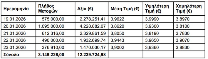 Ειδικότερα, η ΑΛΦΑ ΤΡΑΠΕΖΑ (η ‘Τράπεζα’), σε συνέχεια της από 17.09.2025 ανακοίνωσής της, ενημερώνει ότι, στο Πλαίσιο του Προγράμματος Αγοράς Ιδίων Μετοχών που εγκρίθηκε με την απόφαση της Έκτακτης Γενικής Συνέλευσης των Μετόχων της με ημερομηνία 12.6.2025, κατά το διάστημα 19.01.2026 – 23.01.2026, προέβη σε αγορά μέσω του Χρηματιστηρίου Αθηνών συνολικά 3.149.226 ίδιων μετοχών, με μέση τιμή κτήσης 3,8866 € ανά μετοχή και συνολικό κόστος 12.239.724,98 €.