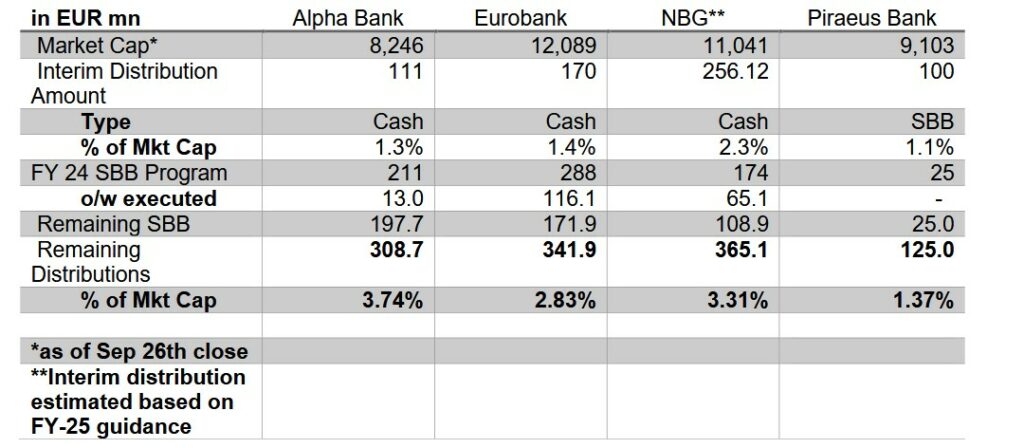 Η Alpha Bank αναδεικνύεται ως η τράπεζα με τη μεγαλύτερη συνολική μερισματική απόδοση μεταξύ των συστημικών τραπεζών για το υπόλοιπο της χρονιάς, λαμβάνοντας υπόψη τη συνδυαστική επίδραση προμερίσματος και επαναγοράς μετοχών.