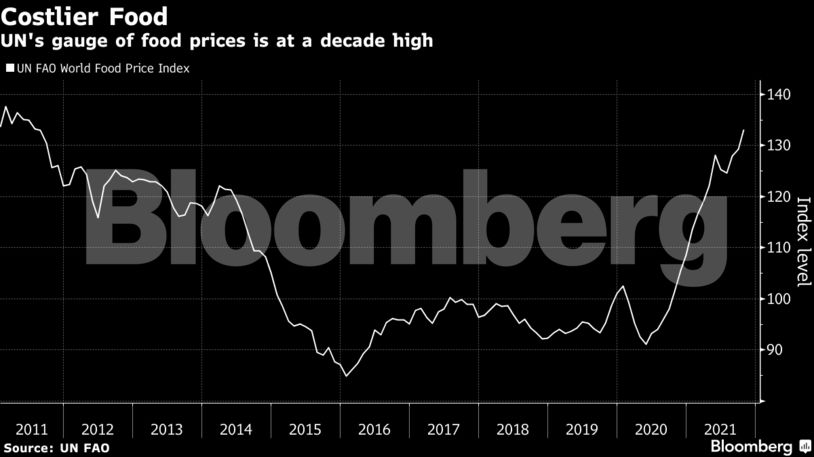 Ο ανάλογος δείκτης του ΟΗΕ βρίσκεται σε υψηλό δεκαετίας λόγω των καιρικών συνθηκών, των προβλημάτων στην εφοδιαστική αλυσίδας και της έλλειψης εργατικού δυναμικού. Όλα αυτά τα προβλήματα έχουν δημιουργήσει πληθωριστικές πιέσεις ανά τον πλανήτη, προκαλώντας ανησυχίες σε κεντρικούς τραπεζίτες και κυβερνήσεις.