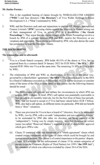 Ένα σημαντικό νομικό φρένο στις επιδιώξεις της JP Morgan να διεκδικήσει σχεδόν 1 δισ. ευρώ από τα εκτελεστικά στελέχη της Viva Wallet μέσω των ελληνικών δικαστηρίων έβαλε με απόφασή του το Ανώτατο Εμπορικό Δικαστήριο του Λονδίνου (Commercial Court). Με μία απόφαση-σταθμό που εκδόθηκε σήμερα το δικαστήριο έκρινε έκρινε πως η αμερικανική τράπεζα παραβίασε τη συμφωνία μετόχων (SHA) με την προσφυγή της στην ελληνική Δικαιοσύνη, και προχώρησε στην έκδοση anti-suit injunction – διαταγής που απαγορεύει την περαιτέρω εκδίκαση της υπόθεσης εκτός Ηνωμένου Βασιλείου.