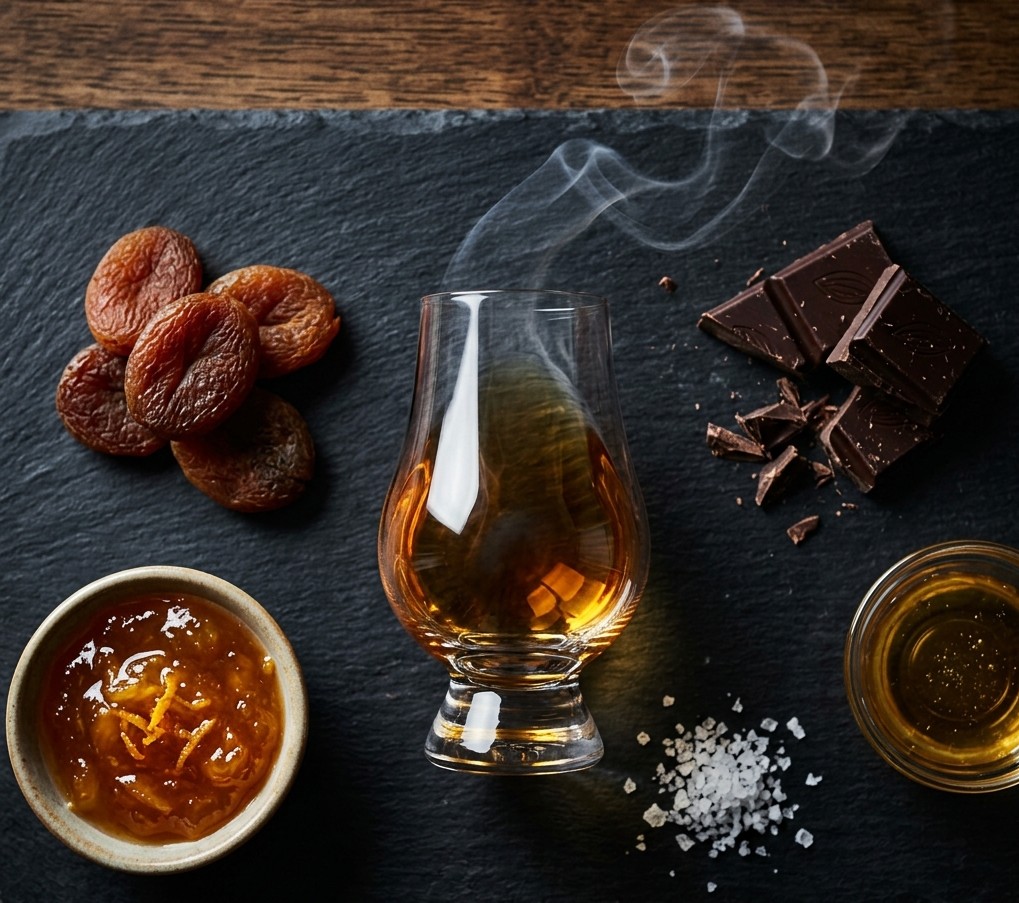 Ας δούμε και το γευστικό του προφίλ. Στη μύτη, το ουίσκι ισορροπεί ανάμεσα σε ώριμο βερίκοκο και καπνό τύρφης, με νότες από άνθη πορτοκαλιάς, βρεγμένο μαλλί, ιώδιο, κρεμώδες φοντάν πορτοκαλιού, γέμιση μηλόπιτας και μια πρέζα μοσχοκάρυδο. Στον ουρανίσκο είναι κρεμώδες και φρουτώδες, με αρχικές νότες lemon curd που συνδυάζονται με πικρό πορτοκάλι, δαμάσκηνο Santa Rosa και μια απαλή πιπεράτη αίσθηση.