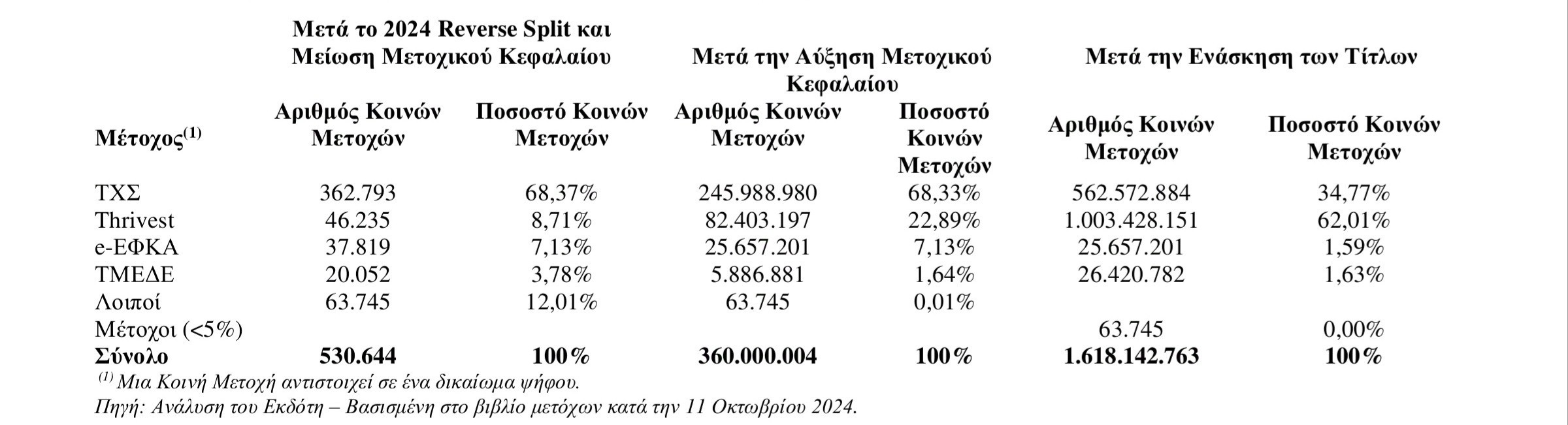 Το Ταμείο Χρηματοπιστωτικής Σταθερότητας θα κατέχει μετά το reverse split και τη μείωση του 68,37% του μετοχικού κεφαλαίου της εταιρίας, μετά την αύξηση κεφαλαίου 68,33% του μετοχικού κεφαλαίου της εταιρίας και μετά την άσκηση των warrants 34,77% της εταιρίας. Τα αντίστοιχα ποσοστά για τη Thrinvest διαμορφώνονται σε 8,71%, 22,89% και 62,01% αντίστοιχα.
