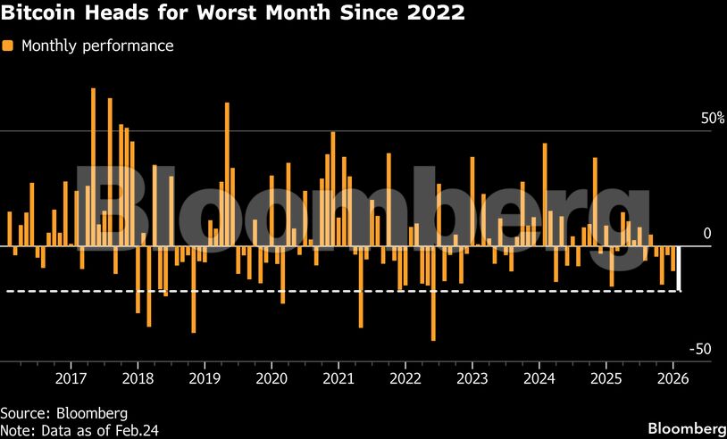 Το μεγαλύτερο κρυπτονόμισμα υποχώρησε έως και 2,64% στα 62.858 δολάρια κατά τη διάρκεια των συναλλαγών στην Ασία. Συνολικά, καταγράφει απώλειες άνω του 19% μέσα στον Φεβρουάριο, οδεύοντας προς τη χειρότερη μηνιαία επίδοσή του από τον Ιούνιο του 2022.
