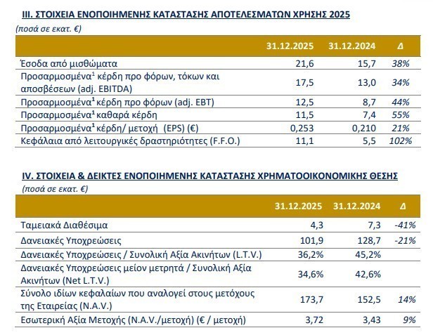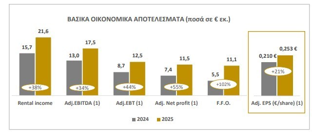 Τα έσοδα από μισθώματα αυξήθηκαν κατά 38% σε € 21,6 εκ., έναντι € 15,7 εκ. το 2024.