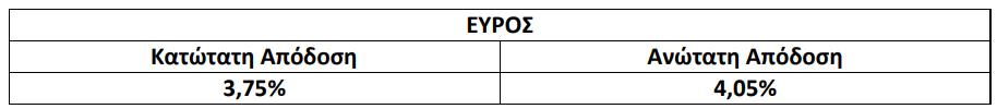 Το εύρος της απόδοσης, το οποίο καθορίστηκε από τους Συντονιστές Κυρίους Αναδόχους και εντός του οποίου οι Ειδικοί Επενδυτές θα υποβάλλουν αιτήσεις κάλυψης, είναι το ακόλουθο: