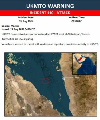 Ο βρετανικός φορέας για την ασφάλεια της ναυσιπλοΐας έλαβε αναφορά για το περιστατικό που σημειώθηκε 77 ναυτικά μίλια δυτικά της Χοντέιντα της Υεμένης.