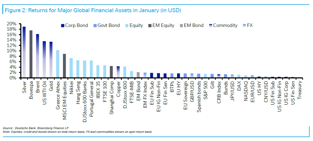 Όπως εξηγεί η Deutsche Bank, η εικόνα των αγορών τον Ιανουάριο ήταν ισχυρή, αλλά ταυτόχρονα εξαιρετικά νευρική. Τα θετικά μακροοικονομικά στοιχεία συνέχισαν να στηρίζουν τα ριψοκίνδυνα περιουσιακά στοιχεία, οδηγώντας τον δείκτη S&P 500 πρόσκαιρα πάνω από τις 7.000 μονάδες για πρώτη φορά στην ιστορία του. Ωστόσο, όπως είχε συμβεί και το 2025, τα εντυπωσιακά πρωτοσέλιδα έκρυβαν έντονη υποκείμενη μεταβλητότητα, καθώς το γεωπολιτικό ρίσκο αυξήθηκε σημαντικά.