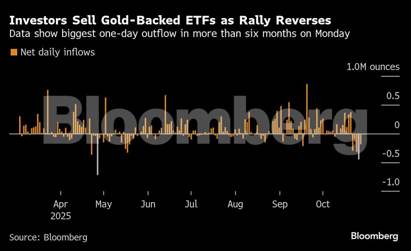 Οι επενδυτές απέσυραν καθαρά 1 δισεκατομμύριο δολάρια από τα SPDR Gold Shares της State Street τη Δευτέρα, το μεγαλύτερο ποσό από τον Απρίλιο, σύμφωνα με στοιχεία που συγκέντρωσε το Bloomberg. Η εκροή ήρθε καθώς το σύνολο των επενδύσεων των επενδυτών σε ETF χρυσού σημείωσε τη μεγαλύτερη πτώση σε έξι μήνες.