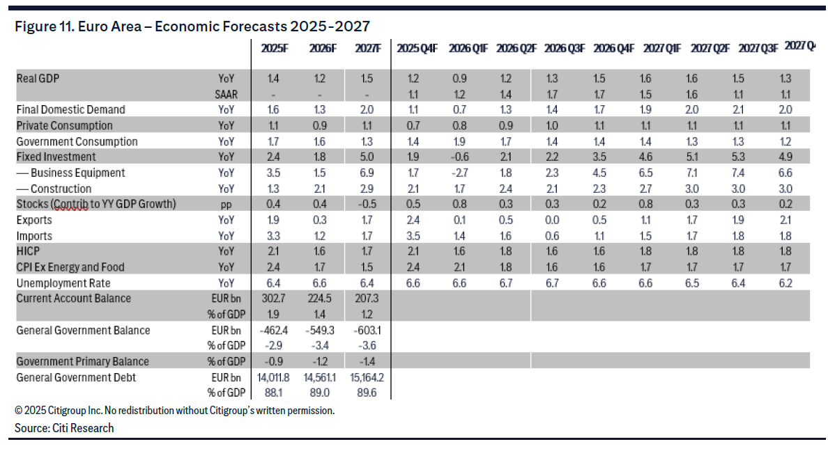 Σύμφωνα με την Citi, η ανάπτυξη της Ευρωζώνης για το 2026 αναθεωρήθηκε προς τα πάνω από το 0,8% στο 1,2%, ενώ για το 2027 αναμένεται να φτάσει το 1,5%, όταν θα φανεί η μεγαλύτερη επίδραση της γερμανικής δημοσιονομικής τόνωσης.