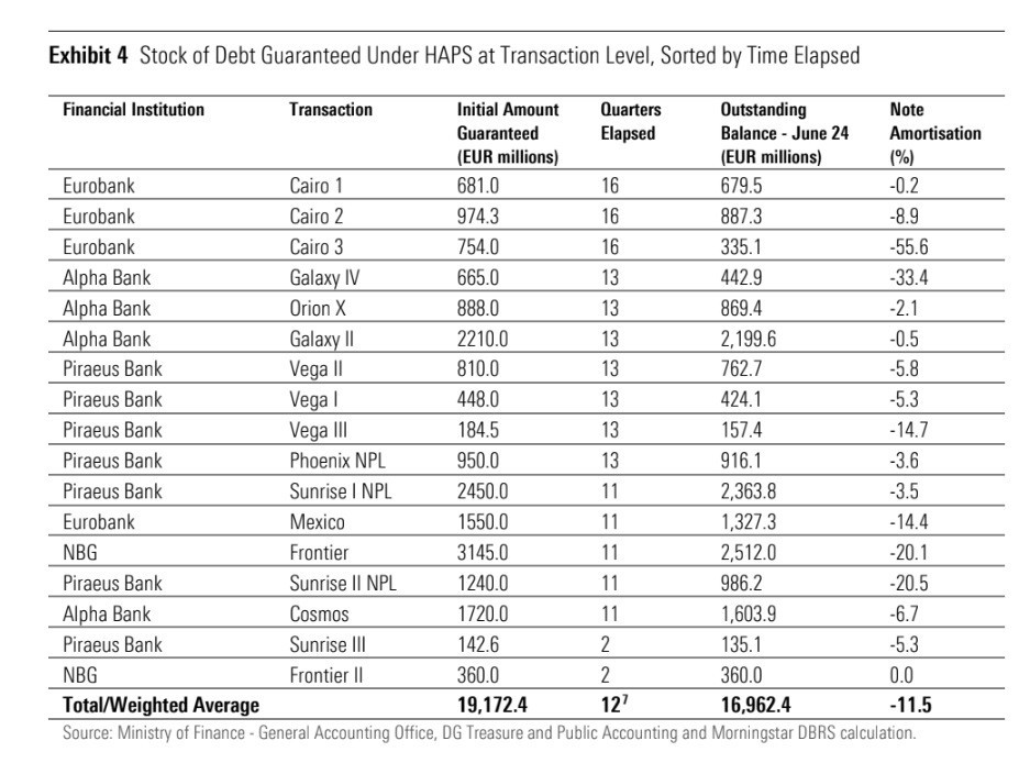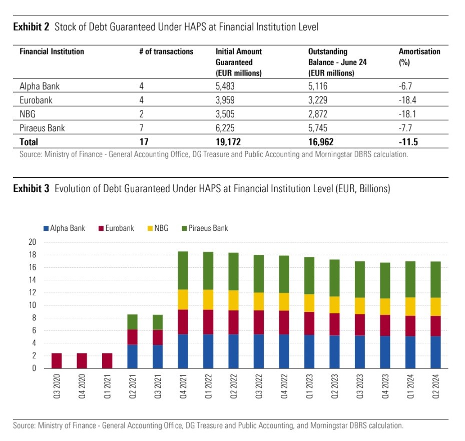 Τον Ιούνιο του 2024, το υπόλοιπο των εγγυημένων ομολόγων υψηλής εξασφάλισης ανέρχεται σε περίπου 17,0 δισ. ευρώ, μια απόσβεση περίπου 11,5%, γεγονός που υποδηλώνει ότι η πλειονότητα των επιχειρηματικών σχεδίων δεν έχει ακόμη εκπονηθεί. Το πρόγραμμα έχει παραταθεί πολλές φορές, η τρίτη ανανέωση του HAPS θα μπορούσε να είναι η τελευταία δόση του προγράμματος», εξηγεί ο οίκος.