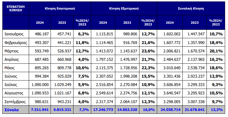 Η επιβατική κίνηση του αεροδρομίου της Αθήνας κατά τη διάρκεια του Σεπτεμβρίου 2024 ανήλθε σε 3,30 εκατ., αυξημένη κατά 9,7% σε σύγκριση με τα επίπεδα του Σεπτεμβρίου 2023.