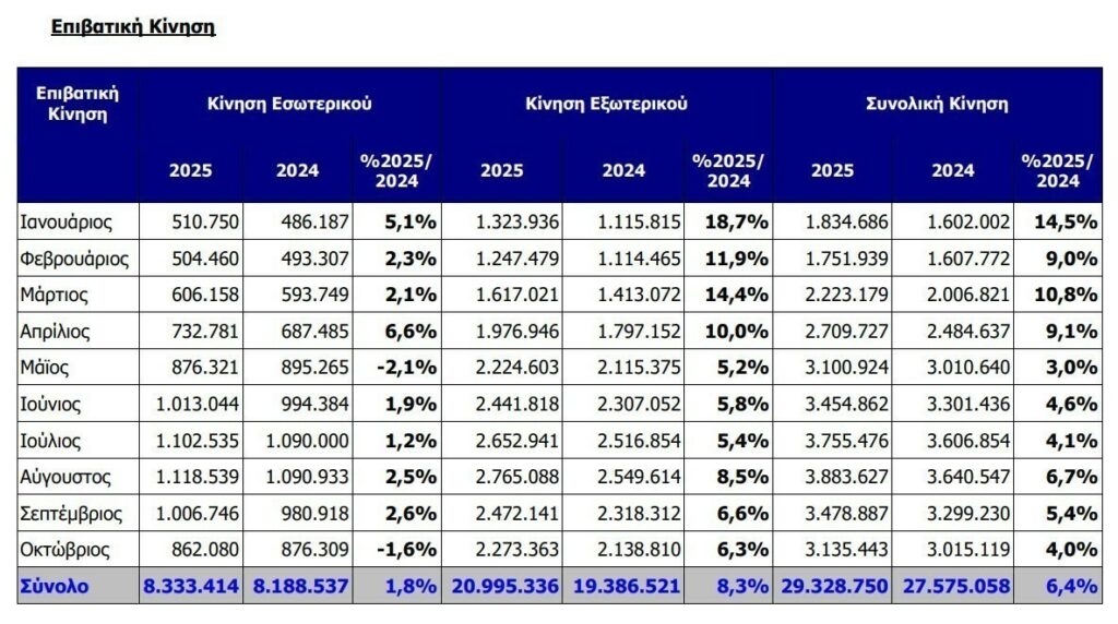 Αύξηση 4% σε σχέση με την αντίστοιχη περσινή περίοδο σημείωσε η επιβατική κίνηση του αεροδρομίου της Αθήνας (ΔΑΑ) κατά τη διάρκεια του Οκτωβρίου, στα 3,13 εκατ.. Ακόμα, η εγχώρια ζήτηση υποχώρησε κατά 1,6% σε σχέση με τα επίπεδα του 2024, ενώ η διεθνής επιβατική κίνηση συνέχισε την ανοδική πορεία της υπερβαίνοντας τα επίπεδα του 2024 κατά 6,3%.