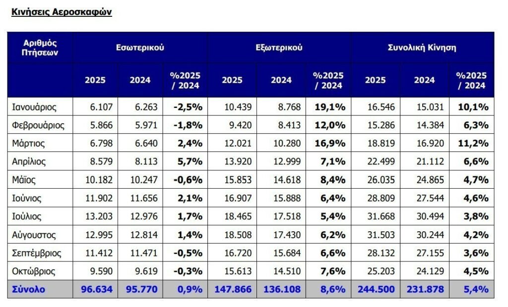 Ο αριθμός των πτήσεων στον Διεθνή Αερολιμένα Αθηνών κατά τη διάρκεια των δέκα πρώτων μηνών του 2025 ανήλθε σε 244.500, καταγράφοντας αύξηση της τάξης του 5,4% σε σχέση με το 2024. Οι πτήσεις εσωτερικού παρουσίασαν άνοδο της τάξης του 0,9%, ενώ οι διεθνείς πτήσεις σημείωσαν αύξηση κατά 8,6% σε σχέση με την αντίστοιχη περίοδο του 2024.