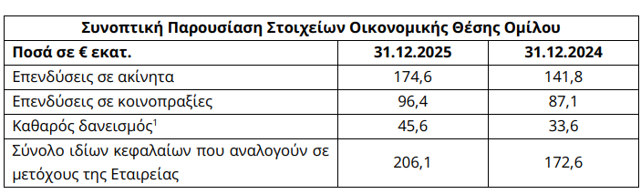 Η εύλογη αξία των επενδύσεων σε ακίνητα του Ομίλου ανήλθε την 31.12.2025 σε €174,6 εκατ. έναντι €141,8 εκατ. την 31.12.2024 και η εύλογη αξία των επενδύσεων σε κοινοπραξίες ανήλθε την 31.12.2025 σε €96,4 εκατ. (31.12.2024: €87,1 εκατ.).