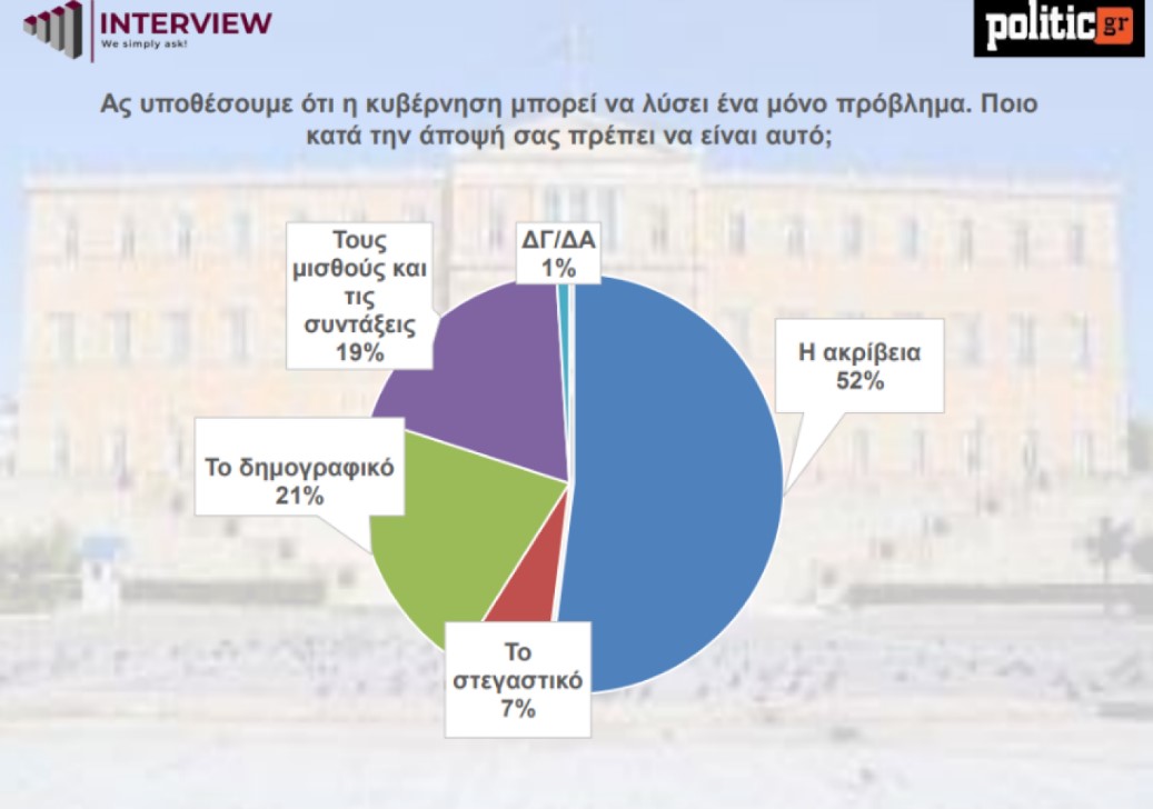 Οι πολίτες, τέλος, επιλέγουν (52%) το στεγαστικό ως το νο1 πρόβλημα σε ένα υποθετικό σενάριο όπου η κυβέρνηση μπορεί να λύσει μόνο ένα, και ακολουθούν το δημογραφικό (21%), οι μισθοί και συντάξεις (19%) και το στεγαστικό (7%).