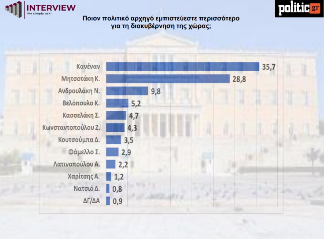 Μαζί με τη ΝΔ, κυρίαρχο είναι και ο Κυριάκος Μητσοτάκης στο ερώτημα ποιον πολιτικό αρχηγό εμπιστεύεστε για τη διακυβέρνηση της χώρας με το 28,8% να επιλέγει τον σημερινό πρωθυπουργό. Ο δεύτερος Νίκος Ανδρουλάκης υπολείπεται 20 μονάδων στο 9,8% και ακολουθούν, Κυριάκος Βελόπουλος με 5,2%, Στέφανος Κασσελάκης με 4,7%, Ζωή Κωνσταντοπούλου με 4,3%, Δημήτρης Κουτσούμπας με 3,5, Σωκράτης Φάμελλος με 2,9%, Αφροδίτη Λατινοπούλου με 2,2%..