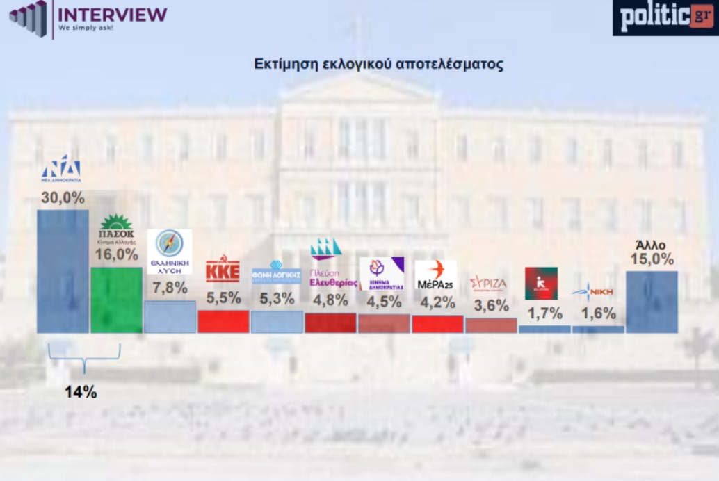 Ξεκάθαρο παραμένει το προβάδισμα της Νέας Δημοκρατίας έναντι του δεύτερου ΠΑΣΟΚ στη δημοσκόπηση της Interview για την ιστοσελίδα Politic.gr.