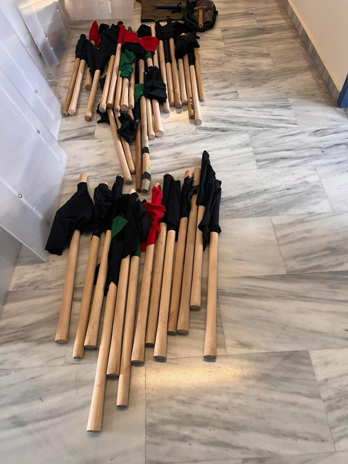 Στο κτήριο που τελούσε υπό κατάληψη βρέθηκαν και κατασχέθηκαν καδρόνια, σφυριά και αντιασφυξιογόνες μάσκες.