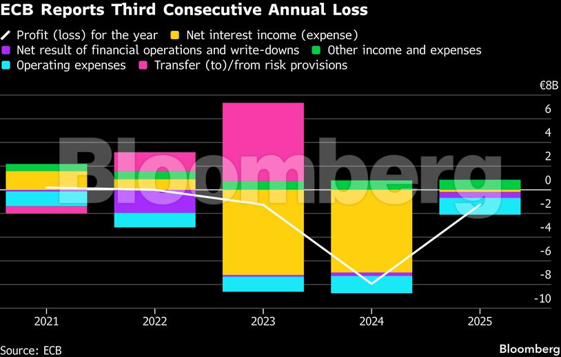 Η ΕΚΤ αναμένει επιστροφή σε κέρδη φέτος ή το 2027, επισημαίνοντας πως αυτό εξαρτάται από τα μελλοντικά επίπεδα των βασικών επιτοκίων της ΕΚΤ, των συναλλαγματικών ισοτιμιών, καθώς και από το μέγεθος και τη σύνθεση του ισολογισμού της.