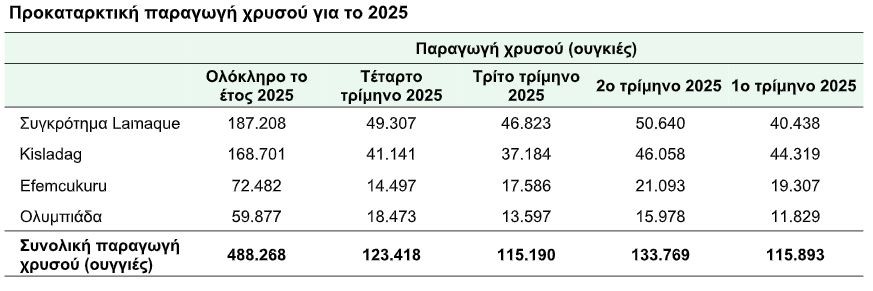 η οποία ανέρχεται σε 123.418 ουγγιές, και την προκαταρκτική παραγωγή χρυσού για ολόκληρο το έτος, η οποία ανέρχεται σε 488.268 ουγγιές. Η παραγωγή του τέταρτου τριμήνου ωθήθηκε από τα ισχυρά αποτελέσματα στο συγκρότημα του Lamaque, ενώ η Ολυμπιάδα επωφελήθηκε από τη βελτίωση της σταθερότητας της επεξεργασίας, επαναφέροντας την παραγωγή στα αναμενόμενα επίπεδα. Επιπλέον, τα Kisladag και Efemcukuru παρουσίασαν σταθερή παραγωγή, σύμφωνα με τις προσδοκίες. Η λεπτομερής παραγωγή, ανά περιουσιακό στοιχείο, παρουσιάζεται στον παρακάτω πίνακα.