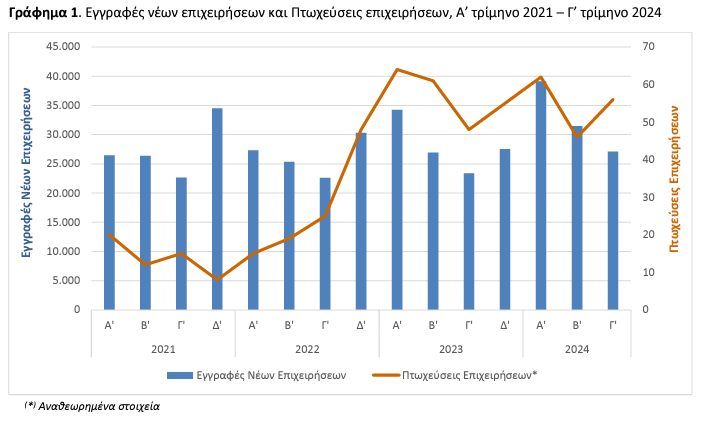 Στον αντίποδα, οι πτωχεύσεις επιχειρήσεων ανήλθαν σε 56, παρουσιάζοντας αύξηση 16,7% σε σχέση με το γ’ τρίμηνο του 2023 που είχαν ανέλθει σε 48.