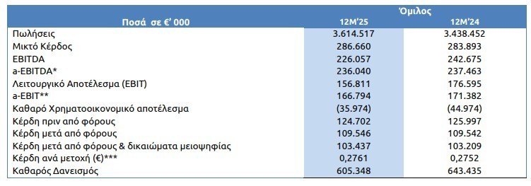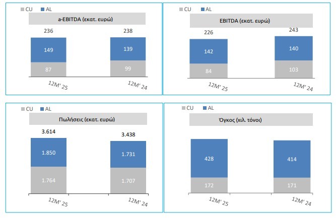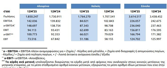 Οι ενοποιημένες πωλήσεις για το 2025 ανήλθαν σε 3.614,5 εκατ. ευρώ, αυξημένες κατά 5,1% σε σύγκριση με 3.438,5 εκατ. ευρώ το 2024, οδηγούμενες από τους αυξημένους όγκους πωλήσεων και τις υψηλότερες τιμές στο LME. Τα αναπροσαρμοσμένα ενοποιημένα κέρδη πριν από φόρους, τόκους, αποσβέσεις, αποτελέσματα μετάλλου και λοιπά έκτακτα κέρδη και ζημίες (a-EBITDA), τα οποία απεικονίζουν καλύτερα την οργανική κερδοφορία του Ομίλου, εμφάνισαν οριακή μείωση κατά 0,6% και διαμορφώθηκαν στα 236,0 εκατ. ευρώ το 2025 έναντι 237,5 εκατ. ευρώ το αντίστοιχο διάστημα του 2024. Το αυξημένο ενεργειακό κόστος, το δυσμενές μείγμα πωλήσεων και οι περιορισμοί στη διαθεσιμότητα των πρώτων υλών επηρέασαν αρνητικά την κερδοφορία του Ομίλου. Τα λογιστικά αποτελέσματα μετάλλου διαμορφώθηκαν σε κέρδη 5,7 εκατ. ευρώ, ελαφρώς χαμηλότερα σε σχέση με τα κέρδη 6,2 εκατ. ευρώ της αντίστοιχης περιόδου το προηγούμενο έτος. Ως αποτέλεσμα των ανωτέρω, τα ενοποιημένα κέρδη προ τόκων, φόρων και αποσβέσεων (EBITDA) ανήλθαν σε 226,1 εκατ. ευρώ, έναντι 242,7 εκατ. ευρώ το 12Μ’24.