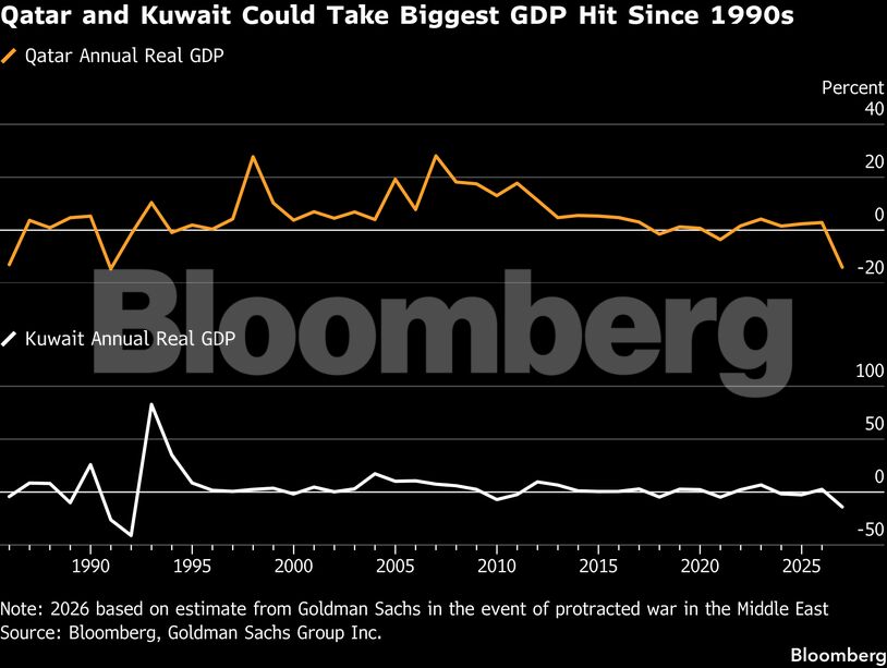 Το Κατάρ και το Κουβέιτ θα μπορούσαν να δουν το ακαθάριστο εγχώριο προϊόν τους να συρρικνώνεται κατά 14% φέτος, σε περίπτωση που η σύγκρουση συνεχιστεί και τα Στενά του Ορμούζ παραμείνουν κλειστά μέχρι τον Απρίλιο, σύμφωνα με τον οικονομολόγο της Goldman Sachs Group Inc., Φαρούκ Σούσα.