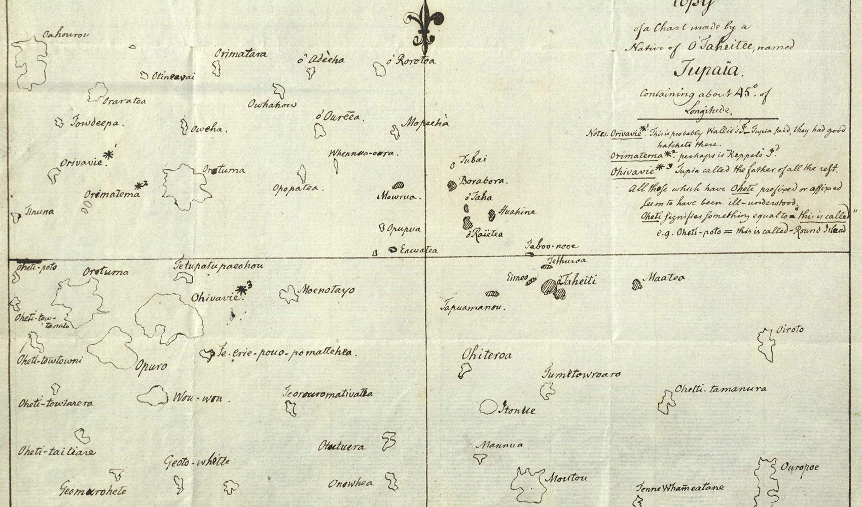 Περισσότερα από 70 νησιά της Πολυνησίας είναι σχεδιασμένα και ονοματισμένα πάνω στο χάρτη του Tupaia. Πολλά από αυτά αντιστοιχούν σε πραγματικά μέρη σε όλη την έκταση του Ειρηνικού, χωρίς όμως η θέση τους να βρίσκεται εκεί που οι μοντέρνοι χάρτες και οι φωτογραφίες πλέον των δορυφόρων, δείχνουν. Και ενώ οι Βρετανοί συνταξιδιώτες του προσπαθούσαν χωρίς επιτυχία να τον διαβάσουν με τις γνώσεις τους, συνειδητοποιούσαν πως ο ίδιος κατάφερνε με απόλυτη ακρίβεια να τους οδηγεί σε κάθε μια από αυτές τις κουκίδες στο χάρτη.
