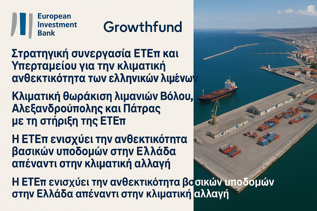 «Η κλιματική αλλαγή αποτελεί μια από τις μεγαλύτερες προκλήσεις της εποχής μας και τα λιμάνια, ως υποδομές καίριας σημασίας για την ελληνική οικονομία, την κοινωνία και τη διασύνδεση της χώρας, βρίσκονται στην πρώτη γραμμή αυτής της πρόκλησης. Η συνεργασία μας με τη Συμβουλευτική Υπηρεσία της Ευρωπαϊκής Τράπεζας Επενδύσεων εντάσσεται στον στρατηγικό σχεδιασμό του Growthfund για την ενίσχυση κρίσιμων δημόσιων υποδομών. Μέσα από τη διενέργεια στοχευμένων Αξιολογήσεων Κινδύνου και Τρωτότητας έναντι της Κλιματικής Αλλαγής (CRVAs), επιδιώκουμε να εξασφαλίσουμε ότι τα λιμάνια του Βόλου, της Αλεξανδρούπολης και της Πάτρας θα είναι καλύτερα θωρακισμένα απέναντι στα ακραία καιρικά φαινόμενα και τις επιπτώσεις της κλιματικής κρίσης. Το Υπερταμείο, αξιοποιώντας τη διεθνή του δικτύωση και παρουσία, την τεχνογνωσία του, καθώς και βέλτιστες ευρωπαϊκές πρακτικές, συμβάλλει ενεργά στη δημιουργία ενός πιο βιώσιμου και ανθεκτικού αναπτυξιακού μοντέλου για τη χώρα μας».