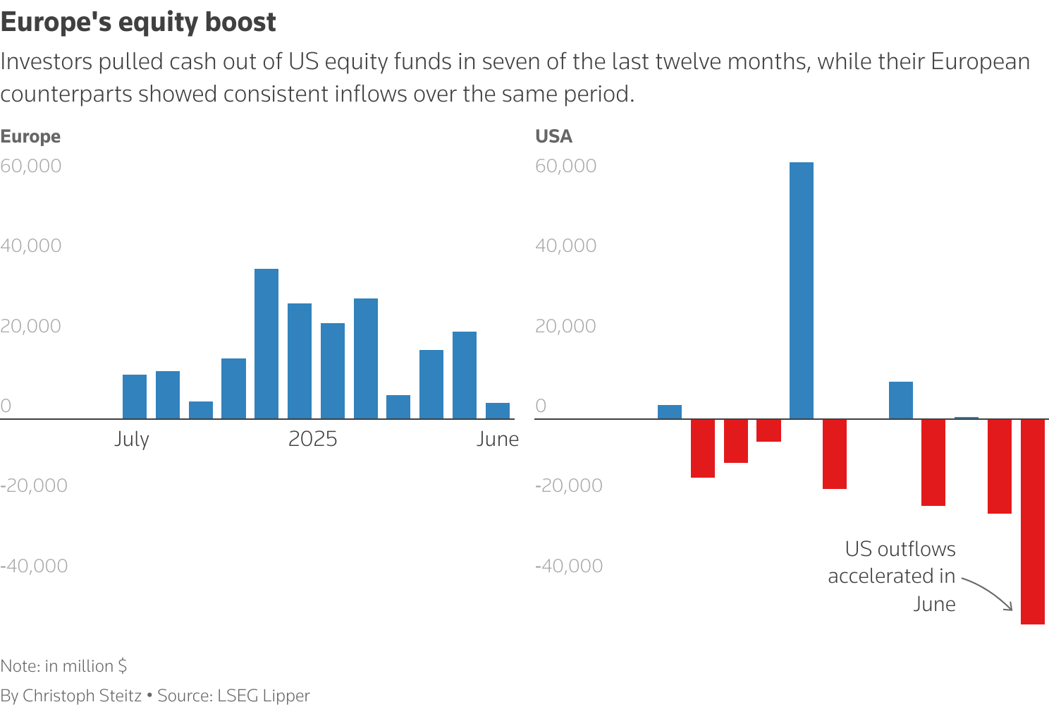 Σύμφωνα με στοιχεία της LSEG Lipper Funds, μέχρι στιγμής φέτος έχουν εισρεύσει περισσότερα από 100 δισεκατομμύρια δολάρια σε ευρωπαϊκά αμοιβαία κεφάλαια – τριπλάσια από την αντίστοιχη περίοδο του περασμένου έτους – ενώ οι εκροές από τις ΗΠΑ υπερδιπλασιάστηκαν σε σχεδόν 87 δισεκατομμύρια δολάρια.