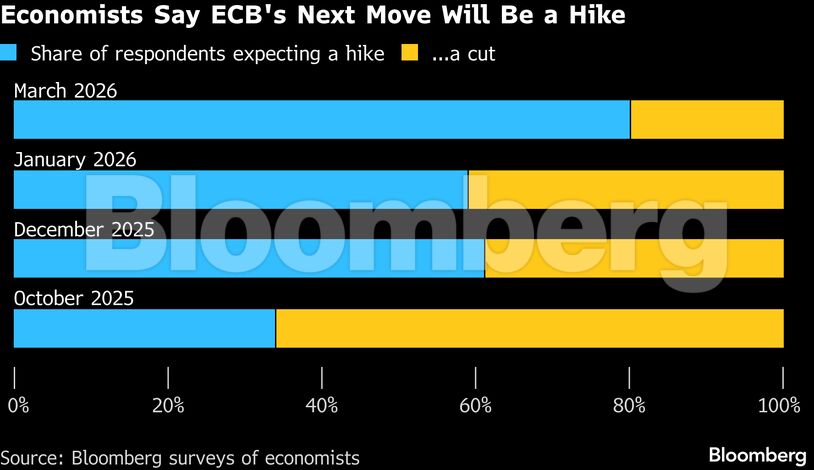 Τέσσερις στους πέντε ερωτηθέντες δηλώνουν ότι η επόμενη κίνηση της ΕΚΤ θα είναι πιθανώς μια αύξηση — από 59% στην τελευταία δημοσκόπηση. Σχεδόν το 60% διαβλέπει ισχυρότερους κινδύνους ανοδικής πίεσης στον πληθωρισμό σε σχέση με πριν, ενώ το 70% δηλώνει πλέον ότι η υπέρβαση του στόχου του 2% αποτελεί μεγαλύτερη απειλή από την υποβάθμιση.