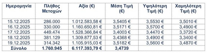 Ειδικότερα, η «Τράπεζα Eurobank Ανώνυμη Εταιρεία» (εφεξής η «Eurobank» ή η «Τράπεζα»), σε συνέχεια της από 12.12.2025 ανακοίνωσής της σχετικά με την έναρξη εφαρμογής του Προγράμματος Επαναγοράς Ιδίων Μετοχών («Πρόγραμμα»), το οποίο εγκρίθηκε με την απόφαση της Έκτακτης Γενικής Συνέλευσης των Μετόχων της Τράπεζας στις 22.10.2025, σύμφωνα με το άρθρο 49 του ν. 4548/2018, σε συνέχεια του αντίστοιχου προγράμματος της «Eurobank Ergasias Υπηρεσιών και Συμμετοχών Ανώνυμη Εταιρεία» («Eurobank Holdings») που θεσπίστηκε με την απόφαση της από 30.04.2025 Τακτικής Γενικής Συνέλευσης των Μετόχων της τελευταίας, και σε συνέχεια της από 22.10.2025 απόφασης του Διοικητικού Συμβουλίου της, ενημερώνει το κοινό ότι κατά το διάστημα 15.12.2025 – 19.12.2025 απέκτησε συνολικά, στο πλαίσιο του Προγράμματος, 1.760.945 μετοχές εκδόσεως της ιδίας («Ίδιες Μετοχές») που διαπραγματεύονται στο Χρηματιστήριο Αθηνών («Χ.Α.»), με μέση τιμή κτήσης €3,4739, ανά μετοχή και συνολικό κόστος €6.117.394,79.