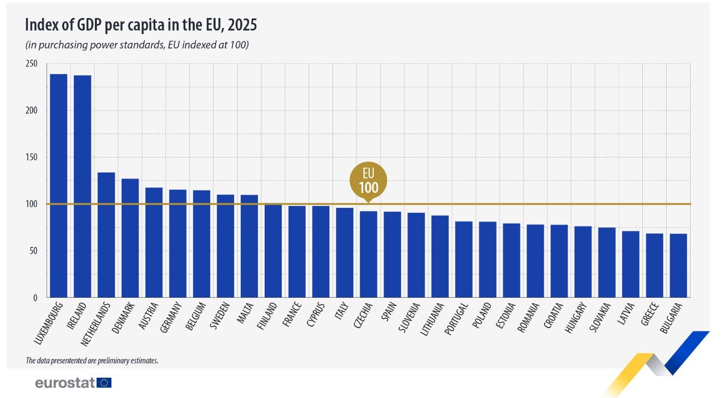 Μεγάλη απόκλιση ανά κράτος – μέλος της Ευρωπαϊκής Ενωσης παρουσιάζουν τα προκαταρκτικά στοιχεία για το ΑΕΠ ανά κάτοικο, εκφρασμένο σε ισοτιμία αγοραστικής δύναμης (PPP) για το έτος 2025, καθώς κυμάνθηκε από 68% του μέσου όρου της ΕΕ στην Ελλάδα και τη .Βουλγαρία έως και 239% του μέσου όρου της ΕΕ στο Λουξεμβούργο, όπως αναφέρει η Eurostat.