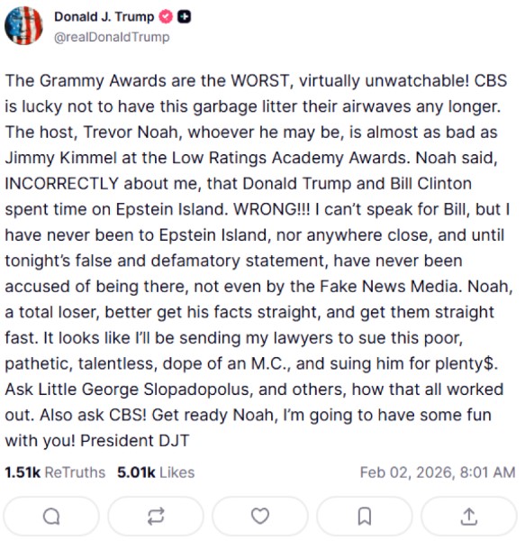 Έντονη πολιτική αντιπαράθεση προκάλεσε η φετινή τελετή των Grammy Awards, με τον Ντόναλντ Τραμπ να εξαπολύει σφοδρή επίθεση τόσο κατά του θεσμού, όσο και κατά του παρουσιαστή Τρέβορ Νόα, λίγες ώρες μετά την ολοκλήρωση της απονομής.