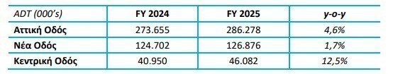 Όσον αφορά τους αυτοκινητόδρομους της Νέας Οδού και της Κεντρικής Οδού, η μέση ημερήσια κίνηση για το 2025 παρουσίασε ετήσια αύξηση κατά 1,7% και 12,5% αντίστοιχα, με τον μέσο ημερήσιο αριθμό διελεύσεων (ADT) να διαμορφώνεται σε 126.876 και 46.082 αντίστοιχα.