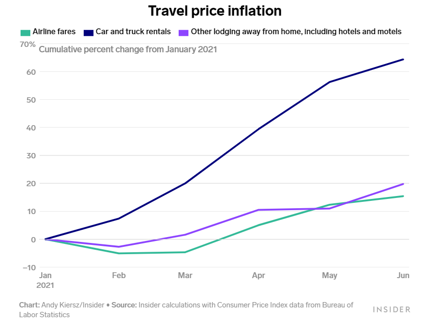 Στην αύξηση των τιμών έχει συμβάλει και η τουριστική βιομηχανία. Αφού πέρασαν ένα χρόνο σε καραντίνα, οι Αμερικανοί ανυπομονούσαν να ταξιδέψουν ξανά. Ο εμβολιασμός και η άρση των περιορισμών τους επέτρεψαν να το κάνουν.