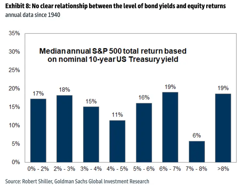 Από το 1940, όταν η απόδοση των 10ετών ομολόγων κυμαινόταν μεταξύ 4% και 5%, ο δείκτης αναφοράς σημείωσε μέση αύξηση 11%. Ωστόσο, οι μετοχές σημείωσαν μεγαλύτερες αυξήσεις σε έτη όπου η απόδοση ήταν τόσο υψηλότερη όσο και χαμηλότερη, σύμφωνα με αναλυτές, οι οποίοι κατέληξαν στο συμπέρασμα ότι δεν υπάρχει σαφής σχέση μεταξύ των αποδόσεων των ομολόγων και των αποδόσεων των μετοχών.